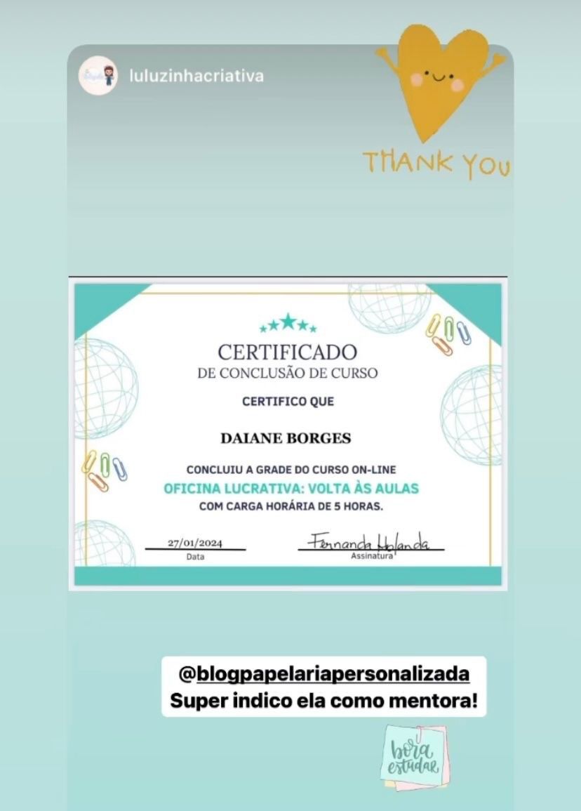 Com mais de 177 mil seguidores no Instagram, mais de 103 mil inscritos no YouTube e mais de 8 mil alunas em todos os meus cursos, eu me dedico a entregar conteúdos de qualidade, práticos e direto ao ponto para que você possa ter sucesso no seu negócio de papelaria.